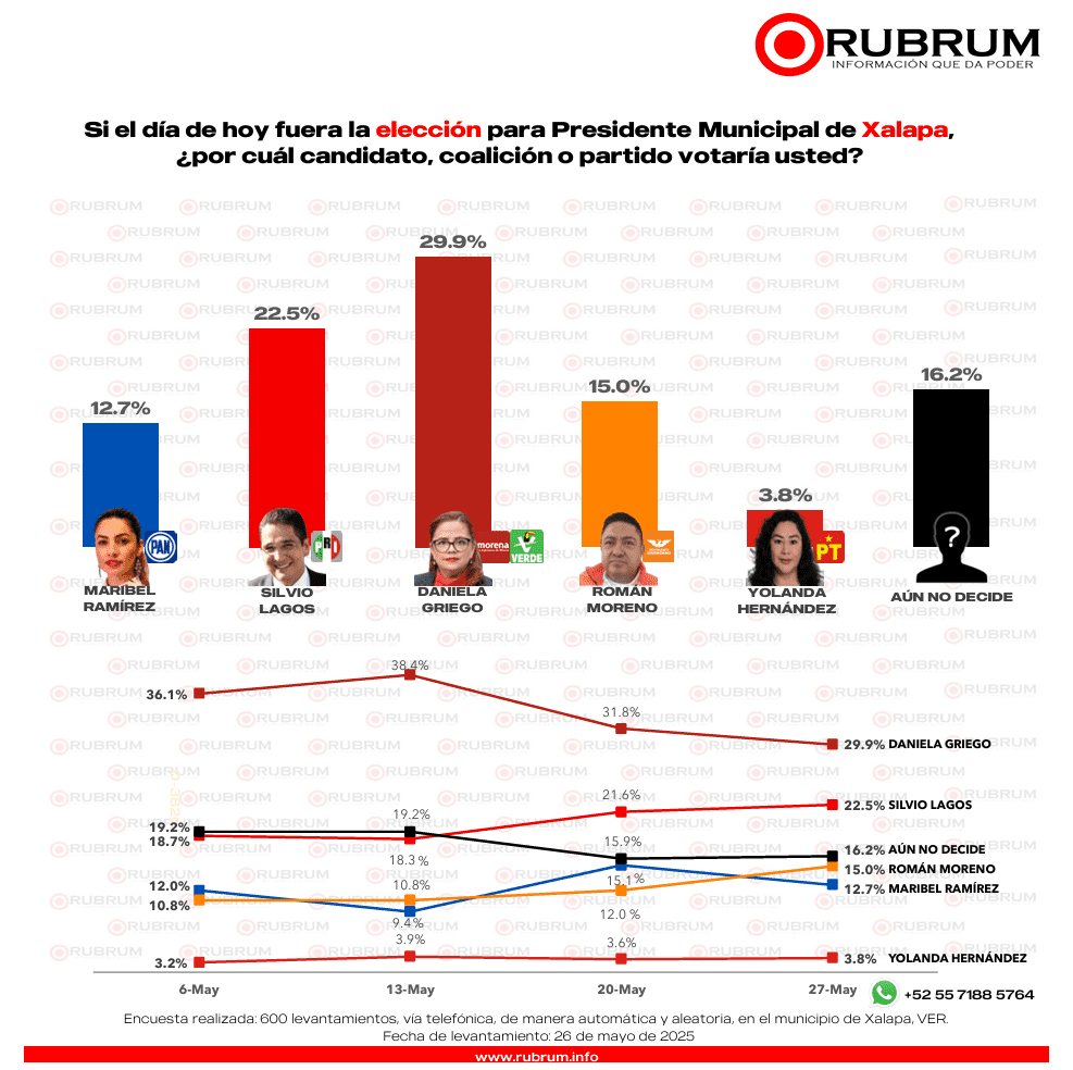 - Xalapa: Daniela Griego de Morena encabeza las preferencias superando por 7 puntos al priista Silvio Lagos.