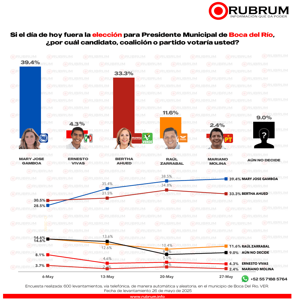 El último estudio realizado por RUBRUM previo a la elección del 1 de junio en Veracruz, arrojó un cambio en la preferencia ciudadana al posicionar a Mary José Gamboa del Partido Acción Nacional con el 39.4% sobre Bertha Ahued de Morena, quien obtiene el 33.2%.