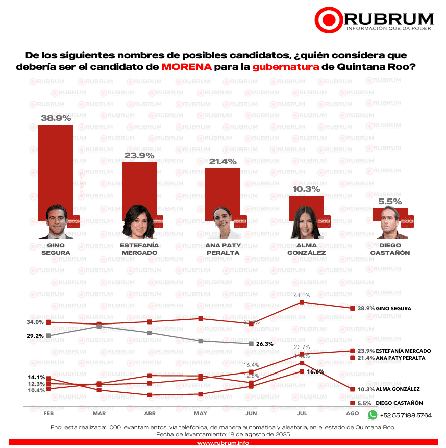 Sin competencia definida, el senador Gino Segura aventaja con el 38.9% las preferencias internas de Morena, superando a Estefanía Mercado, presidenta municipal de Playa del Carmen quien obtiene el 23.9%.