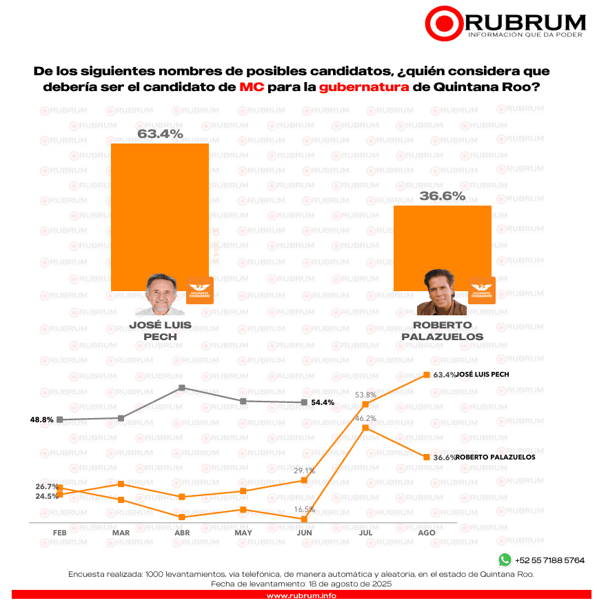 La encuesta de preferencia ciudadana realizada por RUBRUM en agosto con respecto a la elección del 2027 en Quintana Roo, reveló que el partido que lidera la intención de voto para la gubernatura es Morena con el 47.5%.