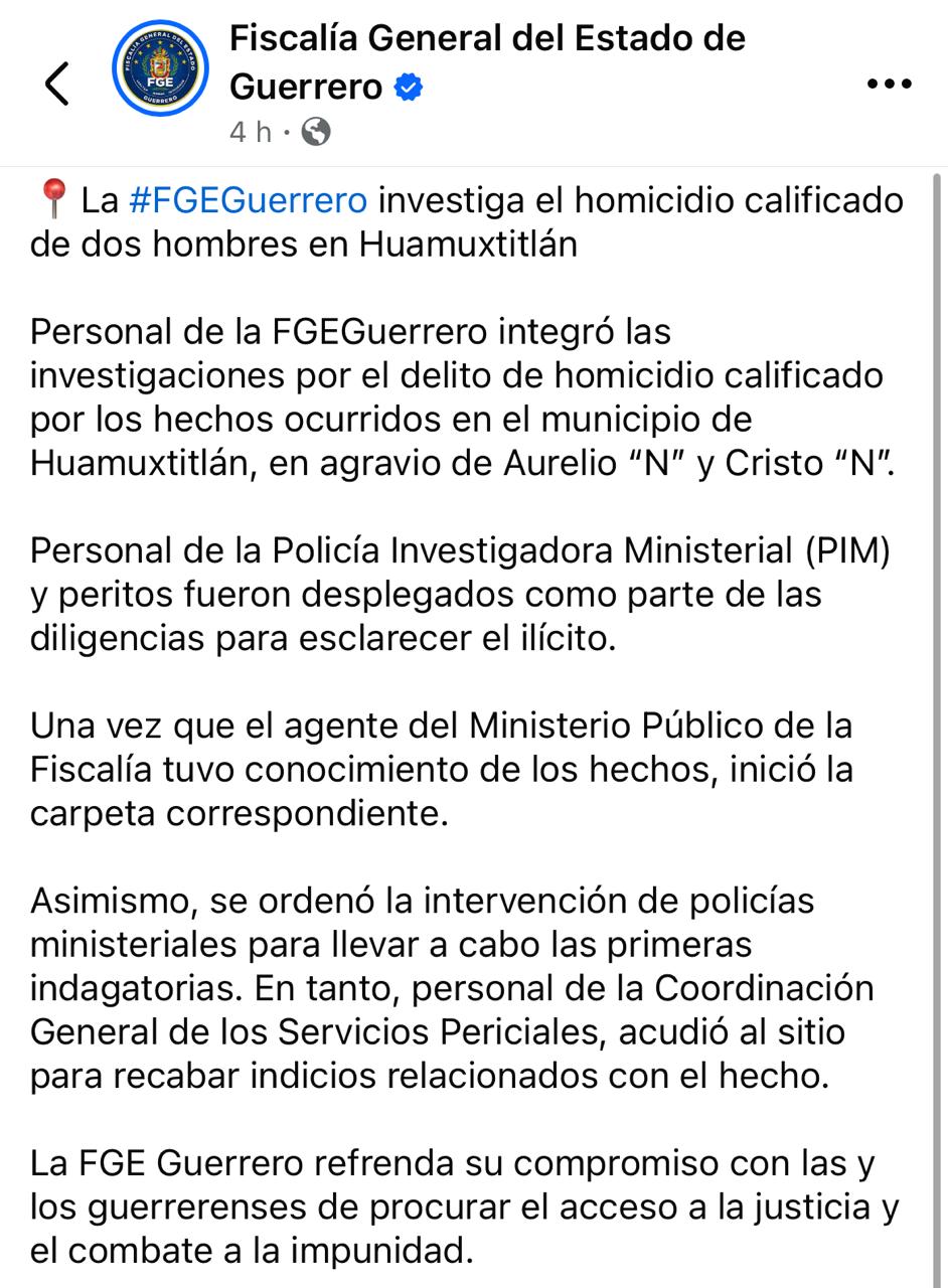 La fiscalía del Estado de Guerrero investiga el homicidio de ambos. En un comunicado emitido aseguró que personal de la Policía Investigadora Ministerial y que peritos ya fueron desplegados para esclarecer el delito.