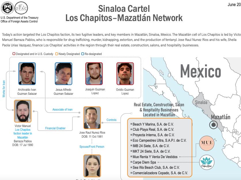 De acuerdo con la OFAC, en coordinación con la Agencia Antidrogas de Estados Unidos (DEA), también se sancionó a una red regional de asociados y empresas de Los Chapitos con sede en Mazatlán, Sinaloa, México, que se dedica al tráfico de drogas, extorsión, secuestro y lavado de dinero.