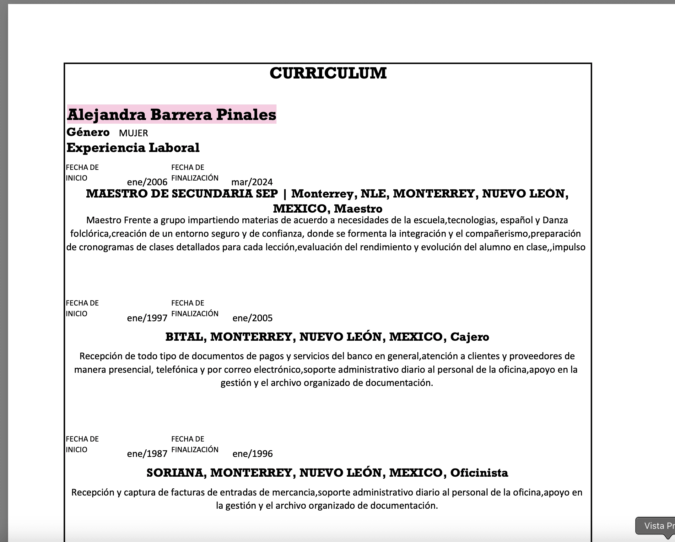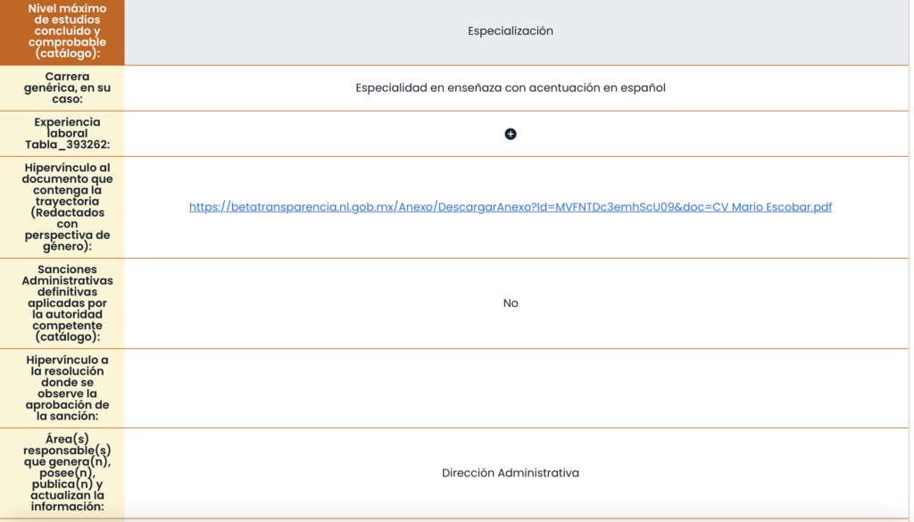 Sin embargo, su currículum registrado en la Plataforma Estatal de Transparencia presenta datos incorrectos o falsos, incluyendo su nombre y género. En dicha plataforma, Mario Escobar aparece registrado con el nombre de Alejandra Barrera Pinales y como mujer.
