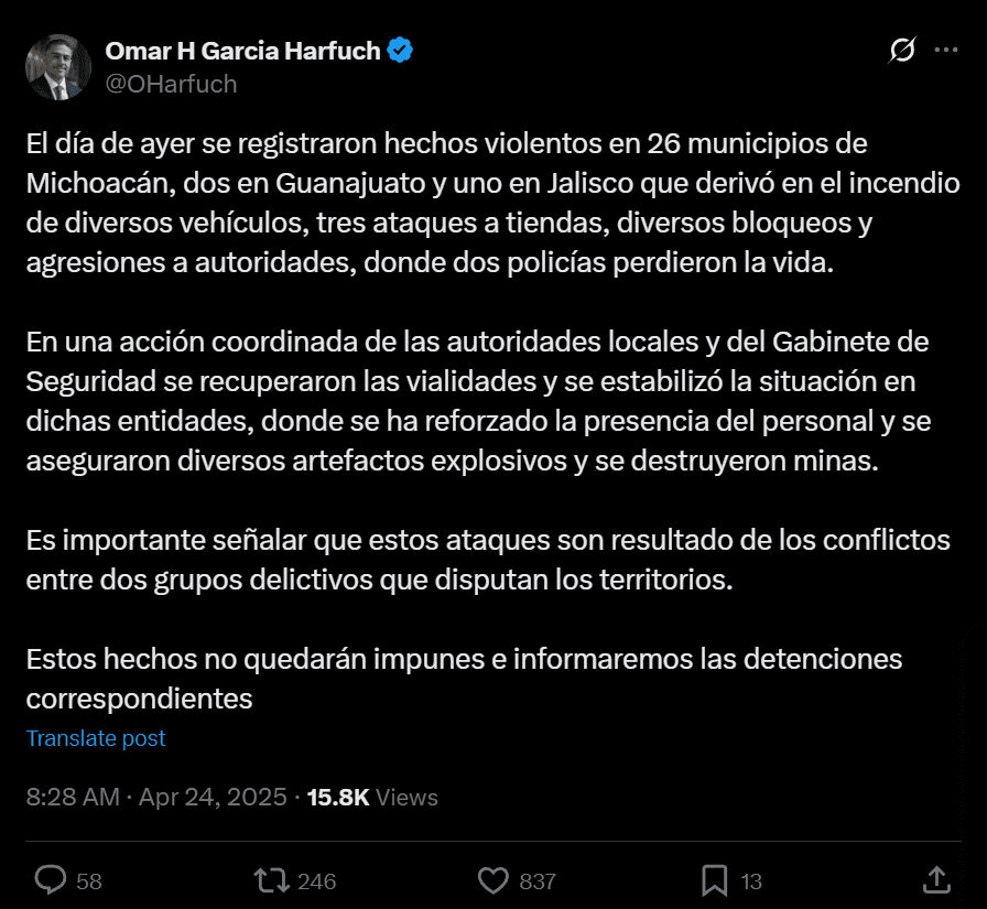 “El día de ayer se registraron hechos violentos en 26 municipios de Michoacán, dos en Guanajuato y uno en Jalisco que derivó en el incendio de diversos vehículos, tres ataques a tiendas, diversos bloqueos y agresiones a autoridades, donde dos policías perdieron la vida”, escribió en X.