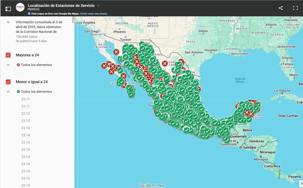 - También indica cuáles gasolineras entre $23.11 hasta $24 pesos el litro y cuáles cobran más de $24 pesos el litro.