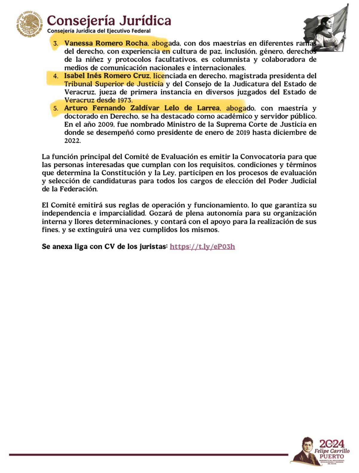 Los nombres seleccionados para el Comité de Evaluación del Poder Ejecutivo son: Mary Cruz Cortés Ornelas, Javier Quijano Baz, Vanessa Romero Rocha, Isabel Inés Romero Cruz y Arturo Zaldívar.