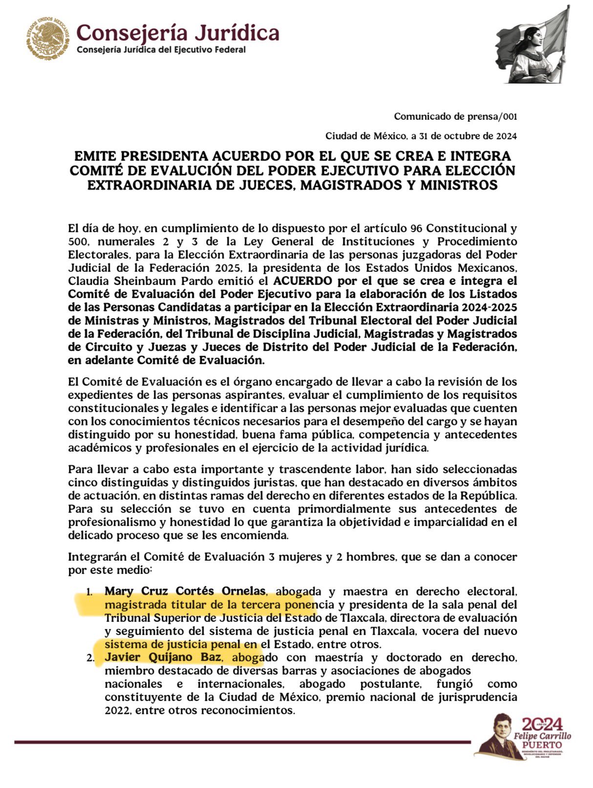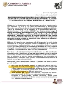 En cumplimiento de lo establecido en el artículo 96 de la Constitución y los numerales 2 y 3 del artículo 500 de la Ley General de Instituciones y Procedimientos Electorales, la presidenta Claudia Sheinbaum emitió un acuerdo para crear el Comité de Evaluación del Poder Ejecutivo.
