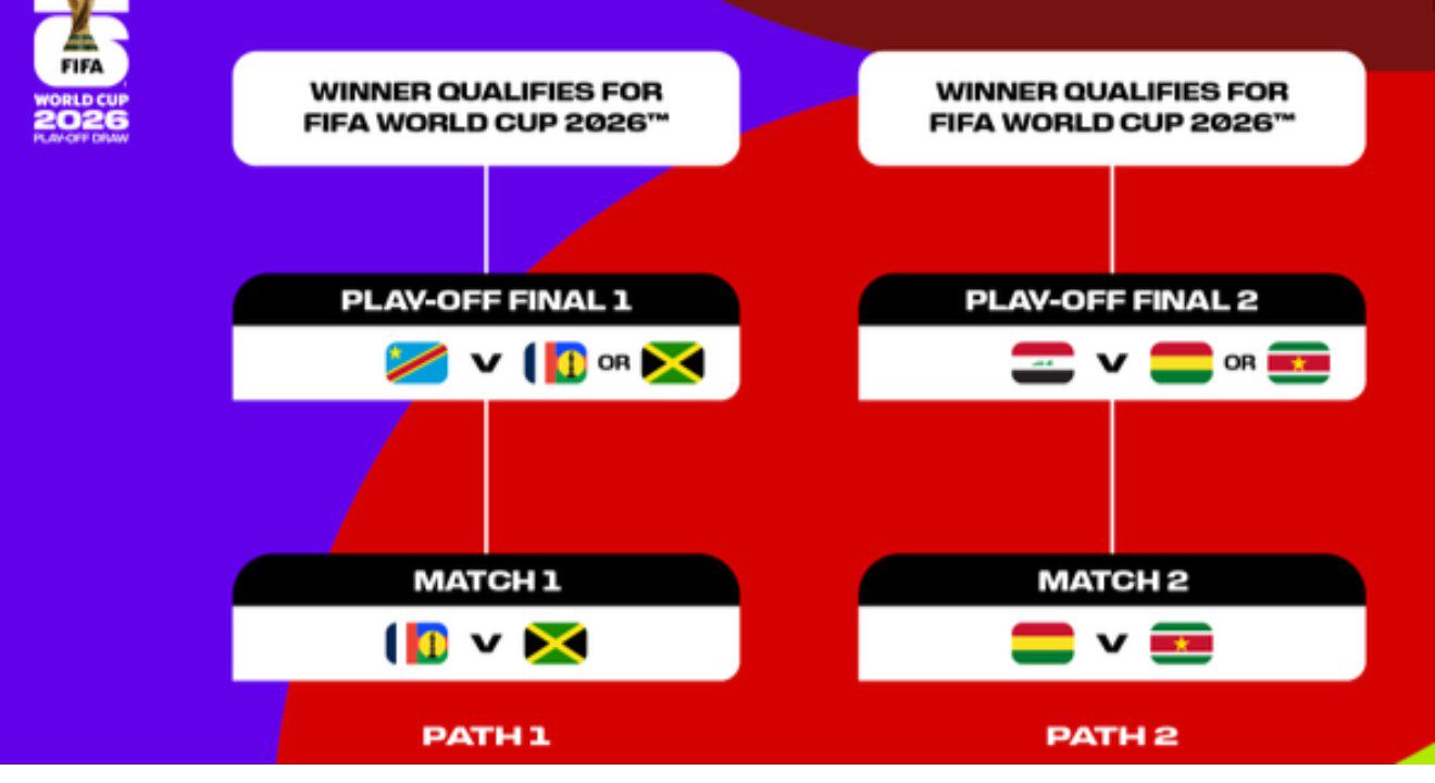 – Semifinal (Juego 1): Nueva Caledonia (OFC, ranking 150) enfrentará a Jamaica (CONCACAF, ranking 68) el 23 de marzo de 2026.
