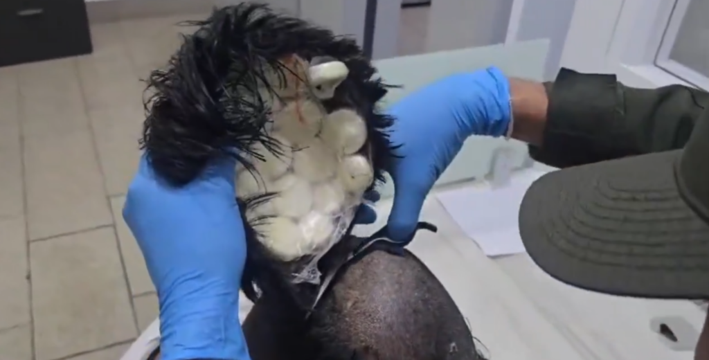 Luego, con unas tijeras comienza a retirar el peluquín y revela los envoltorios de polvo blanco que pareciera ser cocaína. Con una prueba rápida se confirma que sí es un alcaloide por lo que se procede a su detención.