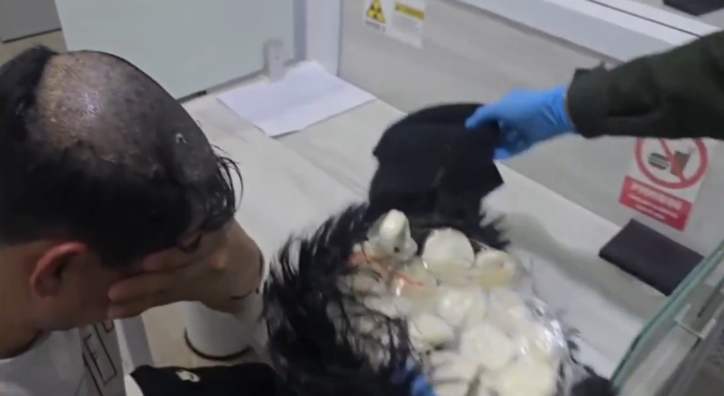 “Buenas tardes, se le está notando algo extraño en su cabeza. Ahí si me autoriza hacerle una inspección a su cabeza”, le dice el policía aeroportuario al hombre para después retirarle la gorra y alzar su cabellera.