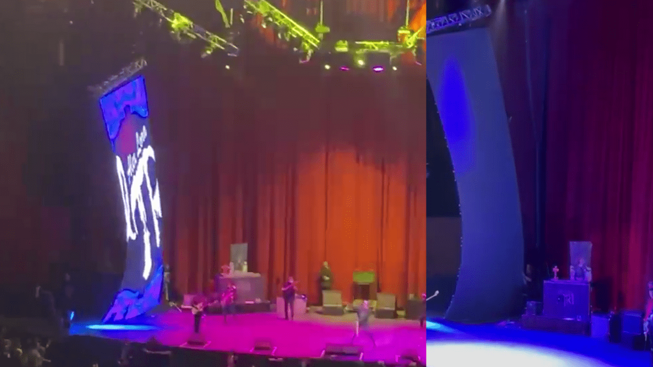 Durante el solo de guitarra, una de las pantallas empezó a tambalearse, hasta colapsar de la estructura que la sostenía. La pantalla LED de 10 metros de altura se dobló, afortunadamente, quedó colgando sobre el escenario y no cayó sobre algún asistente, staff o músico.