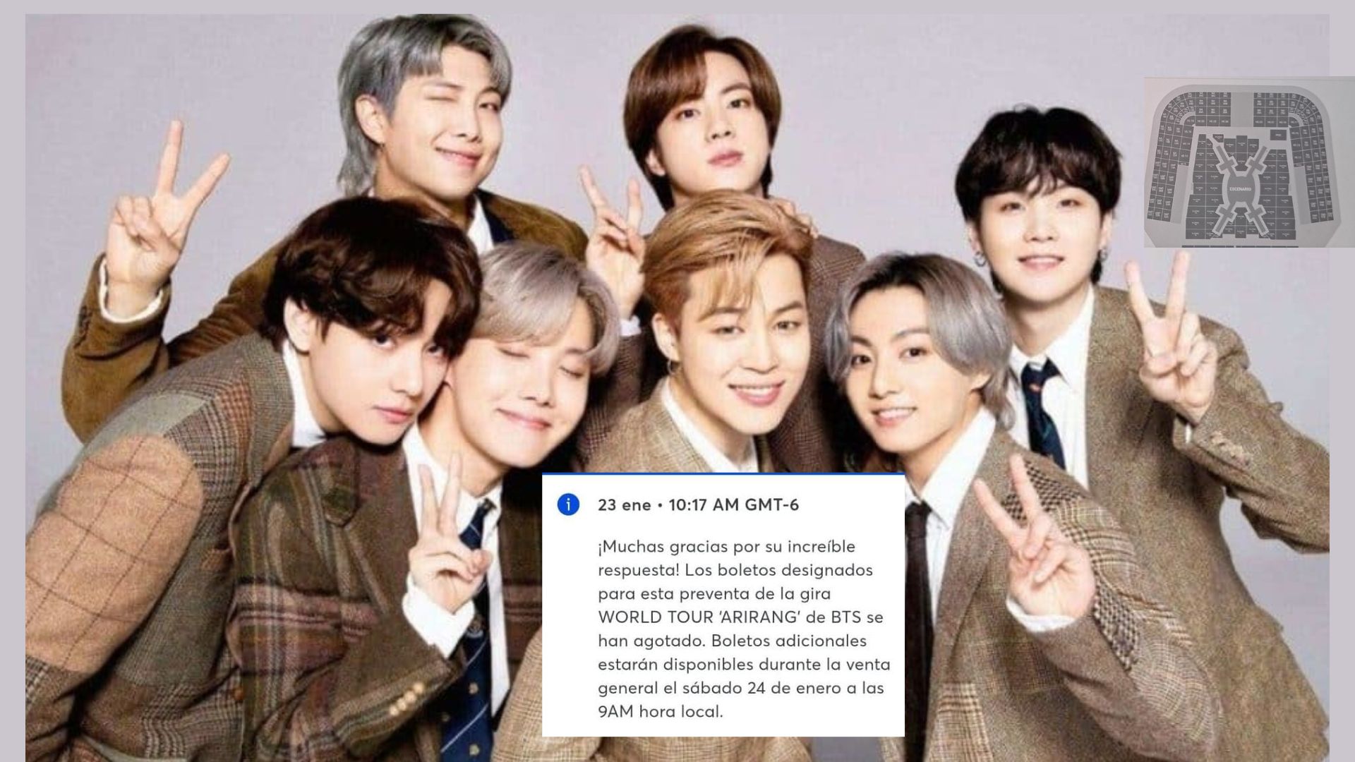 Tan solo en los primeros minutos, las filas virtuales de Ticketmaster superaron los 150 mil usuarios esperando para conseguir su lugar, una señal clara de la enorme demanda que hay por ver a RM, Jin, Suga, J-Hope, Jimin, V y Jungkook en vivo.