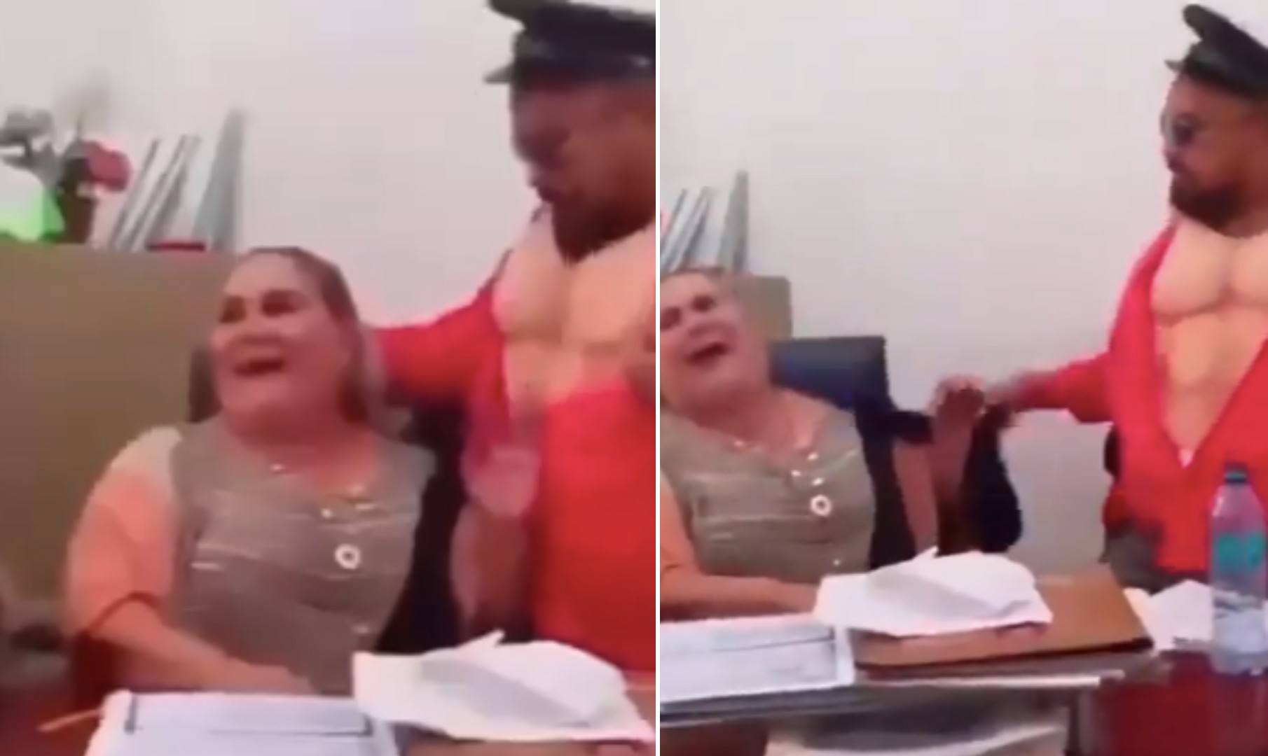 – Un hombre (descrito como bailarín exótico o «stripper», conocido localmente como «Sexy Boy» o similar) ingresa disfrazado con botarga, mallas ajustadas y un gorro tipo quepí de policía.